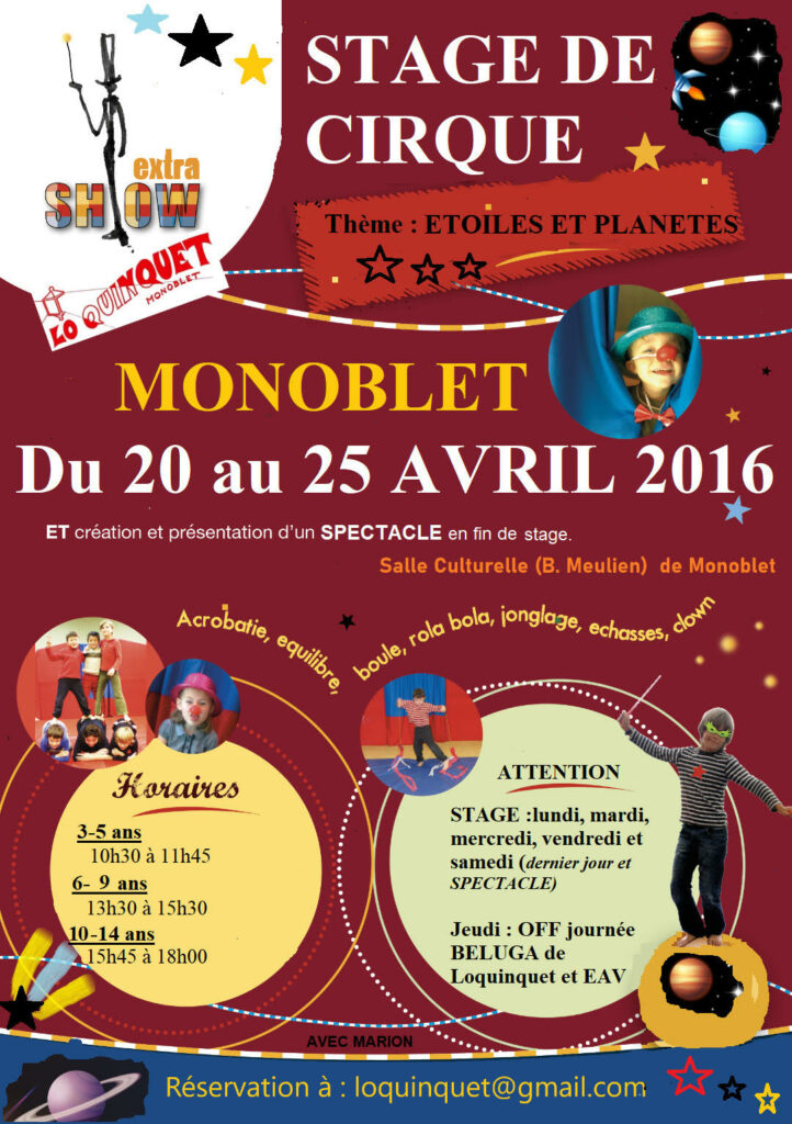 Du 20 au 25 avril (avec une “journée off” le jeudi dans le cadre de l’animation Beluga), dans la salle culturelle B. Meulien, les associations Lo Quinquet et Extra Show proposent un stage de cirque pour enfant avec Marion – Inscription obligatoire à / site internet www.loquinquet.com / 0634382136