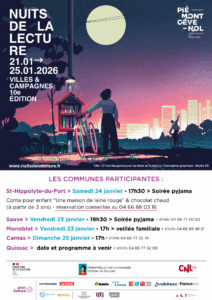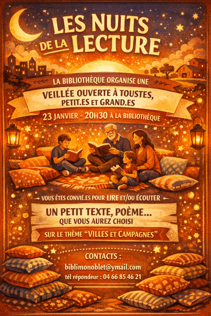 Dans le cadre des Nuits de la Lecture (10e édition) sur le thème “Villes et Campagnes”, la bibliothèque de Monoblet propose, le vendredi 23 janvier à partir de 20h, sa “Veillée Familiale Intergénérationnelle” : contes, poèmes, nouvelles et autres extraits de textes lus à voix haute par qui veut, pour enchanter petits et grands.