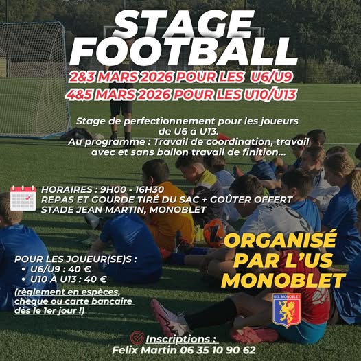Sur le stade, l‘USM organise des stages de foot pour les jeunes de 9h à 16h30 : U6/U9 les 2 et 3 mars, U10/U13 les 4 et 5 mars.