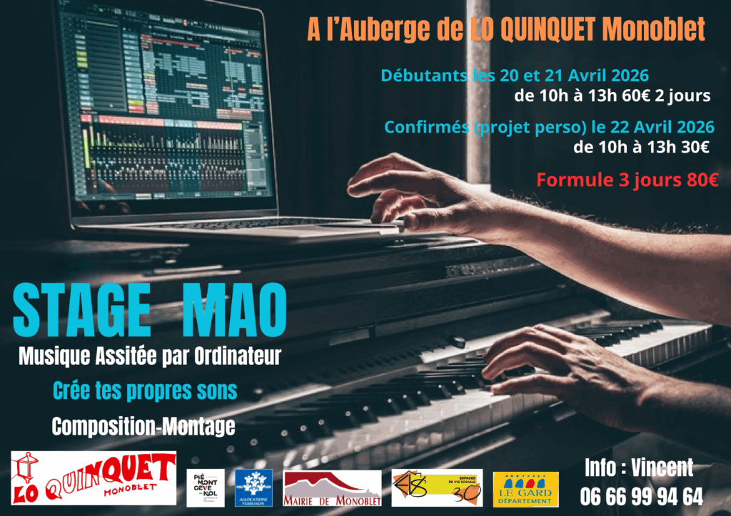 Les 20 et 21 avril, Lo Quinquet propose un stage d’initiation à la Musique Assistée par Ordinateur à l’Auberge, avec Vincent (Prix 60€) et le mercredi 22 avril un stage confirmation (projet son) MAO (prix 30€) Info : 06 66 99 94 64