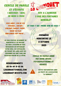 Tous les 1er mercredis du mois de 18h à 19h30 à l’Auberge, l’association Lo Quinquet propose un cercle de parole et d’écoute animé par Marie Girard, psychopraticienne et aidante. Cet 8 octobre, première rencontre ; “Et vous, qui prend soin de vous ?”