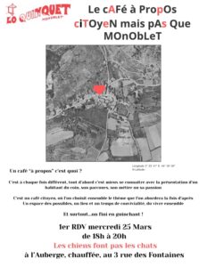 Le mercredi 25 mars de 18 à 20h, à l’auberge de Lo Quinquet, un “café à propos” : un moment pour mieux se connaître, pour échanger (le thème pour la fois suivante est choisi ensemble)… et pour finir, musique !