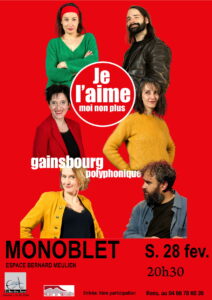 Salle B. Meulien, à 20h30 le samedi 28 février, l’association Écho des Arts reçoit « Je l’aime moi non plus », un spectacle musical autour de l’univers amoureux et poétique de Serge Gainsbourg. Trois couples sont mis en scène et interprétés par six chanteurs-musiciens. Porte des Lilas, ils montent à bord, la sonnerie retentit. Ils nous embarquent dans des chassés-croisés fougueux, tendres, loufoques, … qui réenchantent la poésie de Gainsbourg.