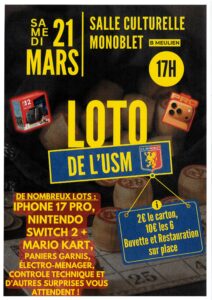 L’USMonoblet propose un loto le samedi 21 mars à 17 heures dans la salle culturelle. Nombreux lots et surprises ! Buvette et petite restauration sur place