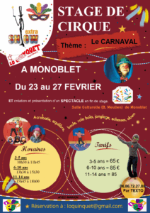 Du 23 au 27 février, dans la salle culturelle B. Meulien, les associations Lo Quinquet et Extra Show proposent un stage de cirque pour enfants avec Marion – Inscription obligatoire à loquinquet@gmail.com / 0686722788