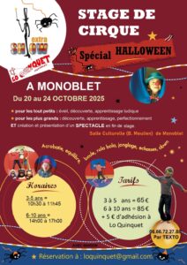 Du 20 au 24 octobre, dans la salle culturelle B. Meulien, les associations Lo Quinquet et Extra Show proposent “ZirKu Bajeczny”, un stage de cirque pour enfant avec Marion – Inscription obligatoire à loquinquet@gmail.com / site internet www.loquinquet.com / 0634382136